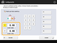 Pulse <X> o <Y> para introducir la longitud de cada cara mediante las teclas numéricas. ![]() Si registra el tamaño de papel que utiliza con más frecuencia en los botones <S1> a <S5>, puede recuperarlo con un solo toque. Registrar papel de tamaño libre (Tamaño de papel personalizado) | |