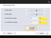 <Volumen alarma>Ajuste el volumen del sonido que se produce al cancelar la transmisión de fax o cuando se acaba de imprimir un fax recibido. Si no desea que se produzca un sonido, pulse