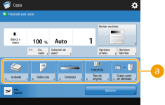 El número de opciones incluidas en la pantalla Funciones básicas y la ubicación donde aparecen varía según las funciones. No se mostrará un botón de acceso directo si <No asignado> se establece como acceso directo. El límite del número de accesos directos para <Opciones> que puede registrar es el siguiente. Copia (básica): 5 Copia (exprés): 6 Fax: 4 Leer y enviar: 2 Si ha cambiado la pantalla de Funciones básicas de copia a la pantalla de Copia exprés (Cambiar las opciones rápidamente (Pantalla de copia exprés)), seleccione el botón en el paso 3 y pulse <Guardar>. |