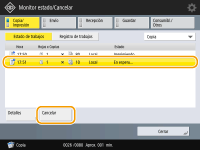 Si pulsa (Stop) en el panel de control cuando hay trabajos de copia en espera, todos los trabajos de copia se detienen y, a continuación, se muestran el mensaje <<Detener>Seleccione el trabajo de copia que desea cancelar.> y la lista de trabajos de copia. Puede seleccionar un trabajo de copia de la lista y cancelarlo pulsando <Cancelar>. Si desea reanudar la copia, pulse <Reanudar copia>. |