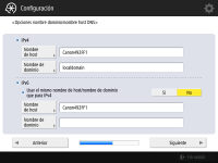 Especifique la dirección del servidor DNS, el nombre del host DNS y el nombre del dominio DNS. ![]() ![]() Pulse <Servidor DNS primario> y <Servidor DNS secundario>, introduzca la dirección IPV4/IPv6 para el servidor DNS y pulse <Siguiente>. Para obtener información sobre las opciones de la dirección del servidor DNS, consulte Configurar opciones de DNS. ![]() ![]() Pulse <Nombre de host> para introducir el nombre del equipo (nombre de host). Pulse <Nombre de dominio> para introducir el nombre de dominio al que pertenece el equipo, y pulse <Siguiente>. Si las opciones de IPv4 y IPv6 son iguales, pulse <Sí> para <Usar el mismo nombre de host/nombre de dominio que para IPv4>. ![]() ![]() Para actualizar automáticamente mediante las Opciones de actualización dinámica de DNS, pulse <Sí> para <Actualización dinámica de DNS>, y pulse <Aceptar>. Si configura <Actualización dinámica de DNS> para <IPv6> como <Sí>, seleccione <Sí> para registrar los elementos automáticamente. | |