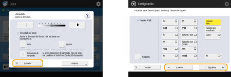 Pulse los botones <-> o <+> para reducir o aumentar los valores, por ejemplo al ajustar la densidad. Cada vez que pulse el botón, el control deslizante () se mueve para aumentar o reducir el valor numérico. Manteniendo pulsado el botón, puede cambiar el valor rápidamente.