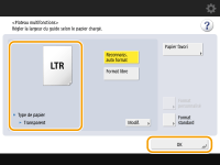 Pour changer le format et le type de papierSi vous chargez un autre type de papier dans l'appareil, assurez-vous de changer le réglage. Si vous ne changez pas le réglage, l'appareil ne peut pas imprimer correctement. Spécification du format et du type de papier dans le magasin/la cassette à papier Lorsque vous changez le format de papier, pensez à changer également l'étiquette de format de papier. (Apposition de l'étiquette du format de papier approprié) Veuillez noter que l'étiquette de format de papier peut indiquer des formats qui ne sont pas disponibles sur l'appareil. |