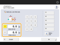 Appuyez sur <X> ou <Y> pour saisir la longueur de chaque côté avec le clavier numérique. ![]() Si vous enregistrez les formats de papier que vous utilisez fréquemment sur les touches <S1> à <S5>, vous pouvez les appeler en appuyant sur une seule touche. Enregistrement de papier de format libre (papier de format personnalisé) | |