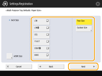 1 | Pressione <Custom Size>. ![]() Você pode especificar o tamanho do papel como <Free Size>, o que elimina a necessidade de inserir configurações de tamanho de papel. Especifique <Free Size> quando carregar papel de tamanho desconhecido para usar para copiar ou quando o tamanho de papel já estiver registrado no driver da impressora. |