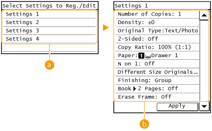 You can register up to four frequently used combinations of copy settings. By simply selecting a registered setting combination when it is needed, you can eliminate the need to configure the same settings every time you make copies, such as if you frequently set the number of copies to 5, set <Erase Frame> to <On>, and increase the sharpness when copying. You can register the setting combinations as <Settings 1> to <Settings 4>.