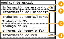 Muestra el estado del equipo, como la cantidad de papel o tóner restante.