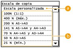 Puede ampliar o reducir las copias utilizando una escala de copia preestablecida, como por ejemplo <A5> → <A4>, o estableciendo una escala de copia personalizada en incrementos del 1%.