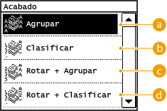 A la hora de preparar varias copias de documentos de varias páginas, puede seleccionar <Agrupar>, <Clasificar>, <Rotar + Agrupar> o <Rotar + Clasificar> para ordenar los papeles de copia. Esta función resulta útil cuando se preparan folletos para reuniones o presentaciones.