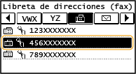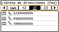 Muestra todos los destinos registrados en la libreta de direcciones. Para obtener información sobre las marcas que aparecen junto a los destinos, eche un vistazo a las siguientes explicaciones.