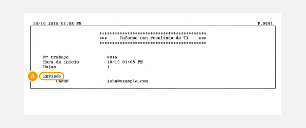 Para el e-mail, los Informes con resultado de TX de e-mail/archivo indican el resultado de transmisión entre el equipo y el servidor de correo, no entre el equipo y la dirección de destino. Aunque la transmisión no se realice correctamente, no se imprimirá ningún código de error de tres dígitos. Para consultar el código de error, imprima un Informe de gestión de comunicaciones (