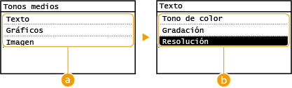 Seleccione el objeto cuya configuración desea cambiar. <Texto> representa las letras y caracteres, <Gráficos> representa las líneas y figuras, y <Imagen> representa las fotos e imágenes.