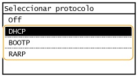 ![]() ![]() Si no desea utilizar DHCP/BOOTP/RARP para asignar una dirección IP Seleccione <Off>. Si selecciona <DHCP>, <BOOTP> o <RARP> cuando estos servicios no están disponibles, el equipo desperdiciará tiempo y recursos de comunicación buscando la red de estos servicios. |
