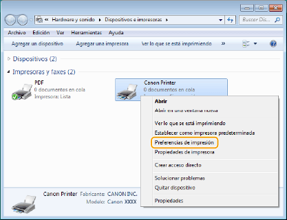 Haga clic con el botón derecho del ratón en el icono del equipo y, a continuación, haga clic en [Preferencias de impresión].