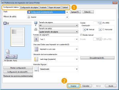 Configure las opciones de impresión de acuerdo con sus necesidades en las pestañas [Configuración básica], [Configuración de página], [Acabado] y [Calidad].