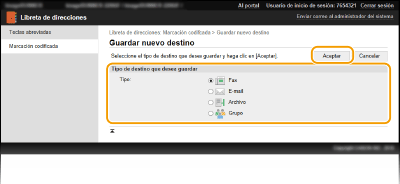 Seleccione [Tipo de destino que desea guardar] y haga clic en [Aceptar].