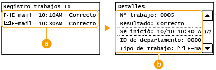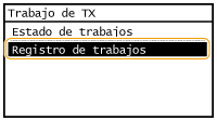![]() <Registro trabajos TX>Muestra una lista de los documentos que se han enviado. <Correcto> aparece cuando un documento se ha enviado correctamente y <Error> aparece cuando un documento no se ha enviado correctamente porque se canceló o se produjo algún error.