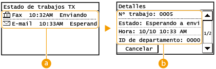 ![]() <Estado de trabajos TX>Muestra la lista de los documentos que se están enviando o a la espera de procesarse.