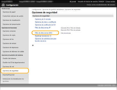 Podrá activar o desactivar las opciones de filtrado de direcciones MAC desde <Menú> en la pantalla <Inicio>. Filtro de direcciones MAC