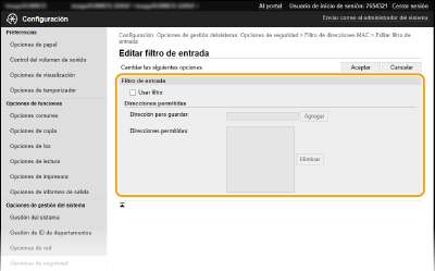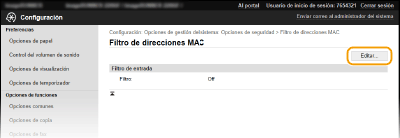 ![]() Comprobación de los errores de entrada Si las direcciones MAC se introducen de forma incorrecta, es posible que no pueda acceder al equipo desde la IU remota, en cuyo caso deberá establecer <Filtro de direcciones MAC> en <Off>. Filtro de direcciones MAC