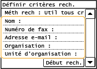 Le nom, les numéros de fax, les adresses e-mail, les noms d'entreprises et les services peuvent servir de critères de recherche de destinataires.