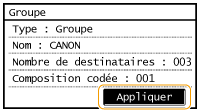 Répétez les étapes 8 à 9 jusqu'à avoir enregistré tous les destinataires souhaités, puis appuyez sur <Appliquer>.