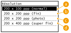 Vous pouvez sélectionner la résolution qui convient au type de document actuel. Plus la résolution est élevée, plus l'image est nette, mais plus la durée de la transmission sera longue.