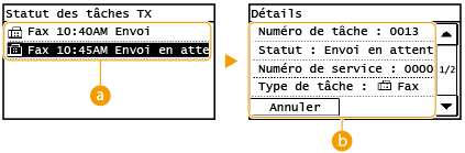 <Détails>Affiche les informations détaillées sur le document sélectionné dans la liste. Si vous avez spécifié plusieurs destinataires, le nombre des destinataires s'affiche à l'écran. Pour examiner les détails des différents destinataires, appuyez sur <Nombre de destinataires>. Si vous jugez qu'un document est sans intérêt, appuyez sur <Annuler> ou <Supprimer>, et appuyez sur <Oui>.