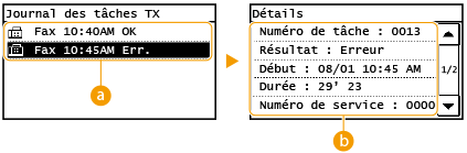 ![]() <Journal des tâches TX>/<Journal des tâches RX>Affiche la liste des documents envoyés et reçus. <OK> s'affiche si un document a bien été envoyé et reçu tandis que <Err.> s'affiche en cas d'échec de l'envoi ou de la réception d'un document, que ce soit parce que ce dernier a été annulé ou en raison d'une erreur.