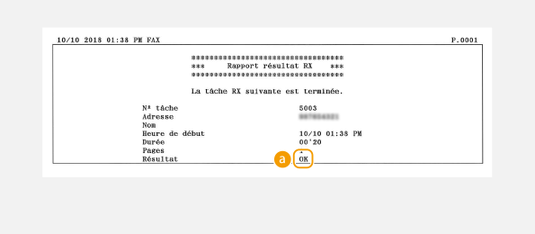 Il est possible de consulter les journaux de fax reçus en imprimant un Rapport résultat RX. Il est possible d'imprimer ce rapport à l'issue de chaque transmission ou en cas d'erreur lors de la réception.