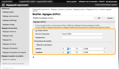 Vous pouvez enregistrer des informations, notamment le nom de l'appareil et le lieu de l'installation, destinées à identifier l'appareil. Il est également possible de désactiver la fonction AirPrint de l'appareil. Servez-vous de l'IU distante pour les modifier.