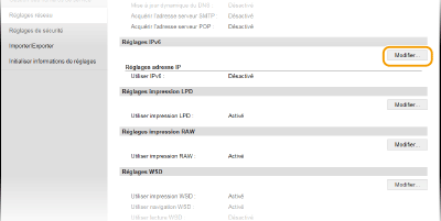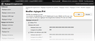 Utilisation du panneau de commandeLes paramètres IPv6 sont également accessibles depuis <Menu> dans l'écran <Accueil>. Réglages IPv6