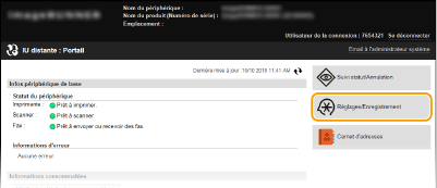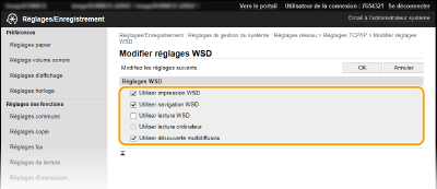 Cochez la case pour obtenir des informations sur l'appareil à partir d'un ordinateur via WSD. Cette case à cocher est automatiquement sélectionnée lorsque la case [Utiliser impression WSD] est cochée. [Utiliser lecture WSD]