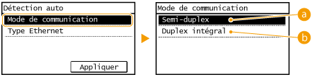 appuyez sur <Semi-duplex> ou <Duplex intégral>.![]() <Semi-duplex>Reçoit et envoie les données de communication en alternance. Sélectionnez cette option si l'appareil est relié à un périphérique de réseau en semi-duplex.