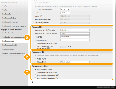 Adopté par Bonjour, le protocole mDNS (multicast DNS) est un protocole associant le nom d'hôte à une adresse IP sans faire intervenir le DNS. Cochez la case pour activer mDNS et saisissez le nom mDNS dans la zone de texte [Nom mDNS]. [Réglages option DHCP][Acquisition nom d'hôte]
