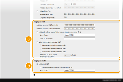 Adopté par Bonjour, le protocole mDNS (multicast DNS) est un protocole associant un nom d'hôte à une adresse IP sans faire intervenir le DNS. Pour activer mDNS, cochez la case. [Utiliser le même nom mDNS que pour IPv4]