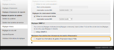 Cochez la case pour activer la surveillance des informations de gestion d'impression de l'appareil via SNMP. Pour désactiver la surveillance, désactivez la case.