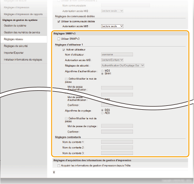Le protocole SNMP (Simple Network Management Protocol) est un protocole dédié à la surveillance et au contrôle des périphériques de communication d'un réseau et fait intervenir une base d'informations de gestion MIB (Management Information Base). L'appareil prend en charge la version SNMPv1 ainsi que la version SNMPv3 dotée de fonctions avancées de sécurité. Vous pouvez vérifier le statut de l'appareil à partir d'un ordinateur lorsque vous imprimez des documents ou utilisez l'IU distante. Vous êtes libre d'activer SNMPv1, SNMPv3 ou encore les deux protocoles à la fois. Indiquez les réglages de chaque version de façon à les adapter à votre environnement réseau et à l'utilisation du réseau.