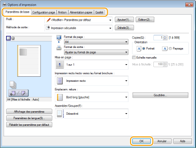 Faites les réglages nécessaires pour l'impression et cliquez sur [OK].