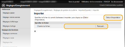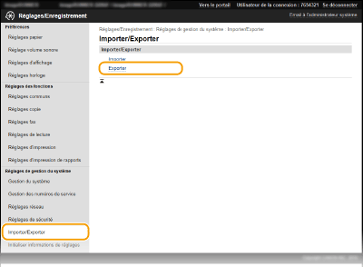 Les informations du carnet d'adresses contenues dans l'appareil peuvent être enregistrées dans l'ordinateur (via une exportation). Les données mémorisées au niveau de l'ordinateur peuvent également être enregistrées dans l'appareil (via une importation). Vous pouvez également facilement copier les destinataires dans le carnet d'adresses sur plusieurs appareils.* Pour utiliser ces fonctions, il est nécessaire de se connecter en mode administrateur système.