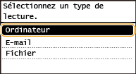 La procédure visant à "numériser un document et à l'enregistrer sur un ordinateur" ne peut être réalisée que lorsque vous numérisez un document à partir de l'appareil. Lors de la numérisation, vous indiquez l'ordinateur sur lequel les documents seront enregistrés, vous spécifiez si vous numérisez les documents en couleur ou en noir et blanc, vous signalez le format dans lequel vous enregistrez les documents (PDF ou JPEG) ainsi que d'autres paramètres.