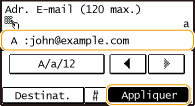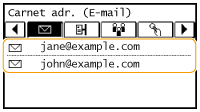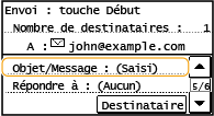 Si vous définissez plusieurs destinataires, le deuxième destinataire et les suivants doivent être enregistrés dans le carnet d'adresses ou sur le serveur LDAP. Vous ne pouvez définir en CC et en CCI que des destinataires enregistrés dans le carnet d'adresses. Pour utiliser le carnet d'adresses, vous devez préalablement exécuter la procédure d'enregistrement.