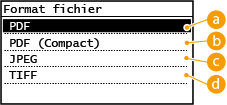 <PDF (Compact)> compresse plus les photos et les illustrations des documents que <PDF>. Le fichier obtenu est plus léger, mais la qualité d'image de certains documents peut être moindre ou le nombre de documents pouvant être numérisés en une opération peut être inférieur.