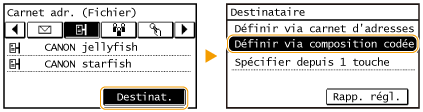 Pour utiliser les numéros de composition codée, le destinataire doit être préalablement enregistré dans le carnet d'adresses. Enregistrement de destinataires dans le carnet d'adresses