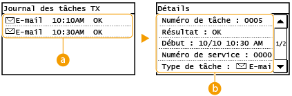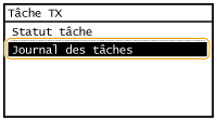 ![]() <Journal des tâches TX>Affiche une liste des documents envoyés. <OK> s'affiche si un document a bien été envoyé tandis que <Err.> s'affiche en cas d'échec de l'envoi, que ce soit en raison d'une annulation ou d'une erreur.