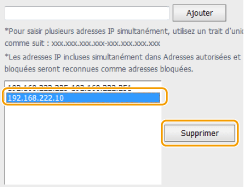 Saisissez l'adresse IP (ou la plage d'adresses IP) dans la zone de texte [Adresse à mémoriser] et cliquez sur [Ajouter].