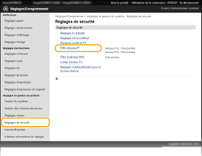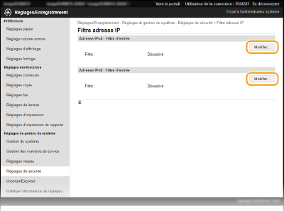 En cas de saisie incorrecte des adresses IP, vous risquez de ne pas pouvoir accéder à l'appareil via l'IU distante. Si cela devait se produire, il faudrait définir <Filtre d'adresse IPv4> ou <Filtre d'adresse IPv6> sur <Désactivé>. Filtre d'adresse IPv4 Filtre d'adresse IPv6