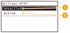 Le protocole HTTP permet d'établir une liaison réseau (lors de l'accès à l'appareil via l'IU distante, par exemple). Si vous utilisez une connexion USB ou n'avez pas besoin d'établir une communication HTTP, vous pouvez désactiver le mode HTTP pour bloquer les intrusions de tierces parties via le port HTTP inutilisé.