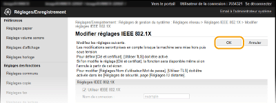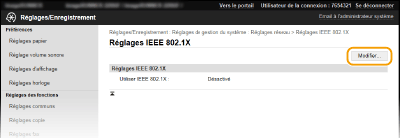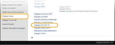 Utilisation du panneau de commandeVous pouvez également activer ou désactiver l'authentification IEEE 802.1X à partir de <Menu>, dans l'écran <Accueil>. Réglages IEEE 802.1X