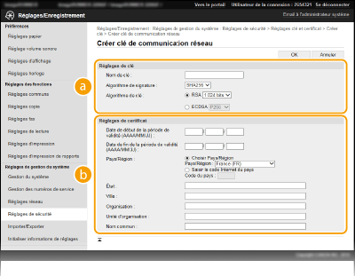 Il est possible de générer une paire de clés sur l'appareil lorsqu'elle est nécessaire à une communication cryptée en TLS (Transport Layer Security). Vous pouvez utiliser le cryptage TLS lorsque vous accédez à l'appareil au moyen de l'IU distante. Vous pouvez enregistrer jusqu'à cinq paires de clés (en comptant les paires préinstallées) sur l'appareil. Les certificats auto-signés sont utilisés avec les paires de clés générées dans "Communication réseau". Avec une "Clé et demande de signature de certificat (CSR)", vous pouvez demander un certificat numérique émis par une autorité de certification pour la paire de clés générée par l'appareil.